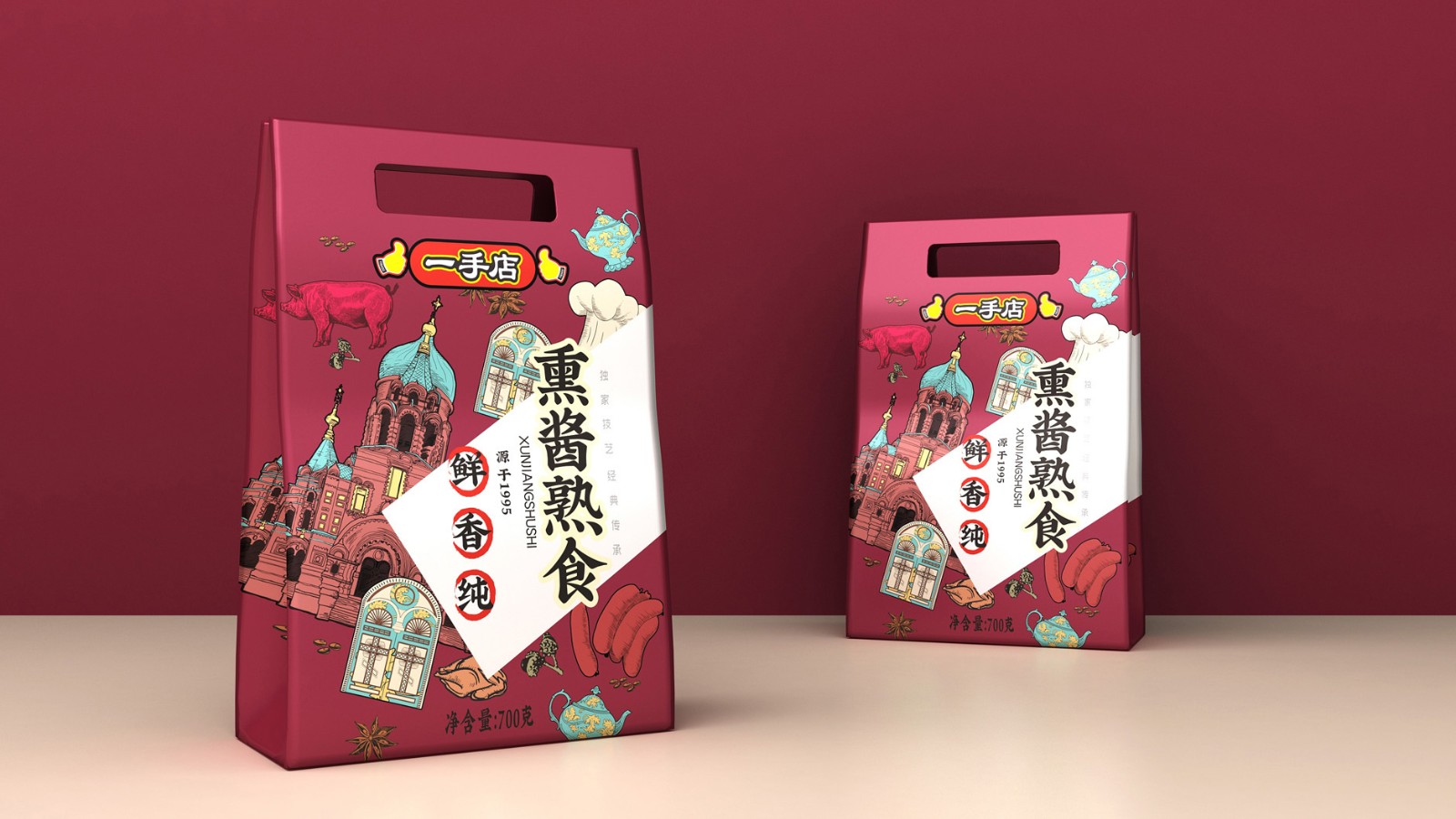 熟食食品包裝設計的易攜帶性也是很重要的,如果是包裝盒的話,提手設計是必備的,可以是單獨增加的一個布料質感的提手,也可以在紙盒上預留提手位置,這兩種提手設計在方便提取的同時,還不會很勒手。